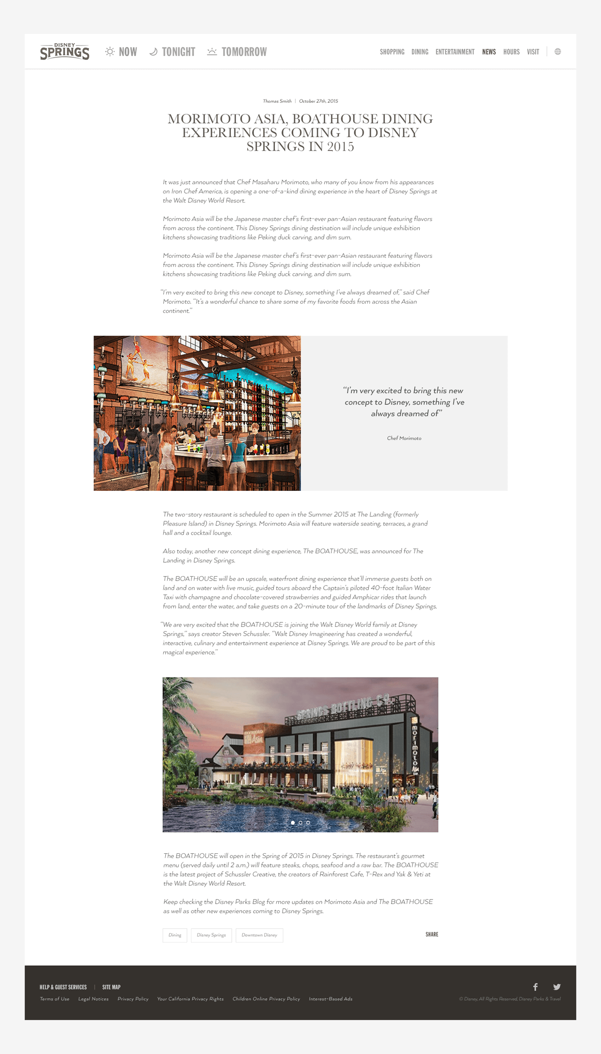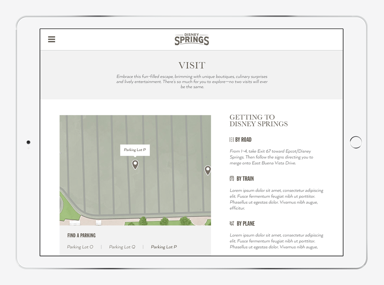 Disney Springs est un nouveau lieu placé à Disneyland en Floride. Le site présente les activités, magasins et restaurants présents sur place. Il a été conçu de manière à ce que le contenu change en fonction de l'heure d'arrivée de l'internaute, un menu permet également d'afficher les activités ouvertes aujourd'hui, ce soir et demain.