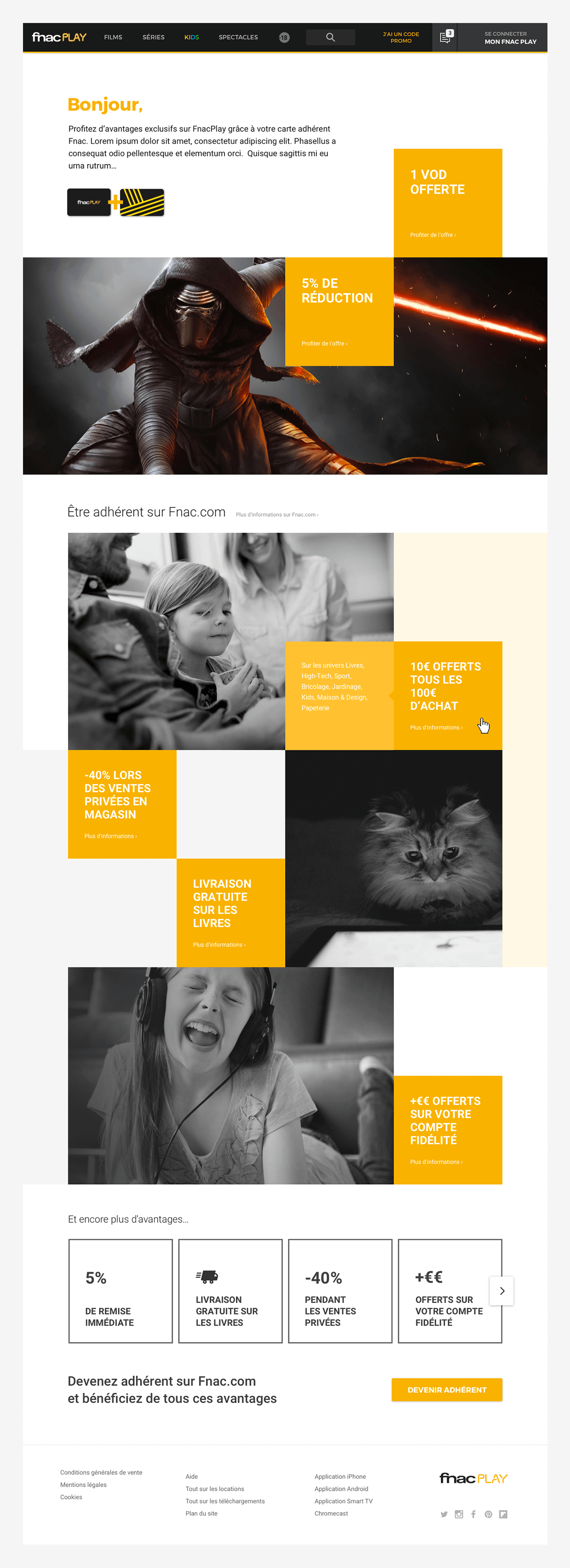 J'ai travaillé sur plusieurs projets pour FnacPLAY, la plateforme de vidéos à la demande de FNAC. J'ai par exemple réalisé une page pour la section enfant du site ou une landing page présentant leur nouvelle fonctionnalité permettant de regarder les films en réalité virtuelle.